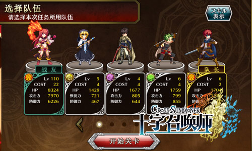 《十字召唤师》每个伙伴的招式都不同:有远程、近战、回复,魔法等。玩家只要在适当的时候点击屏幕操作,角色就可以使出普通攻击、必杀技、奥义等等多样的招式,其中奥义的招式非常华丽。在战斗中,任务向左侧是你的必杀值,右侧红色的是你的奥义值,必杀值回复的比较快,满了以后就可以释放必杀技,而奥义值需要在战斗中获得。其中游戏还可以进行角色的强化和觉醒。角色的成长可以通过战斗胜利获得的经验或者通过获得的强化点和金币进行直接强化,每次战斗得到的点数和金钱可以让新角色马上加入主力团队战斗,因为战斗本身可以升级,而且通过自由关卡等的也可以获得点数,所以点数的获得并不难。
