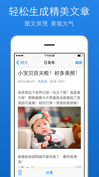 - 父母们用它分享宝贝成长记录,记心情讲故事,让晒娃更加有趣。
