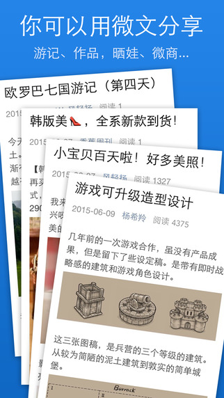 - 批量导入图片,任意位置添加文字,随意调整图片和文字位置。- 单篇微文支持多达50张照片、50000字。