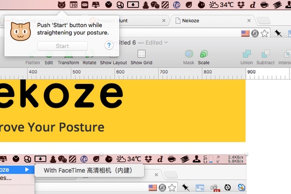 点击「Start Nekoze」,选择 Mac 电脑内建的 iSight 摄像头来开始监控。这时 iSight 相机灯会被点亮,调整好你的坐姿点击「Start」开始监控。
