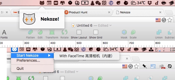 Nekeoze 会记录下你的正确坐姿,通过 iSight 时刻监测你的坐姿是否正确。当监测到开始驼背的时候应用会发出一声猫叫同时弹出下图中带有小猫 logo 的通知信息,这个时候就需要记得将腰挺直了。