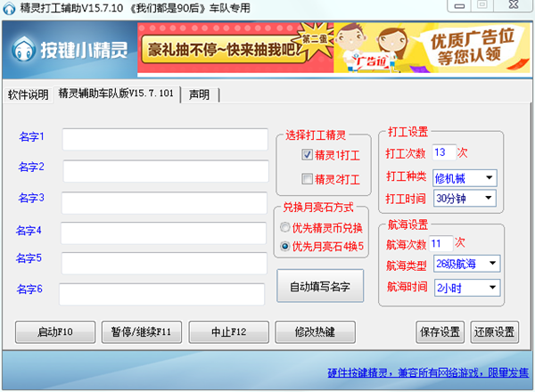QQ飞车精灵辅助功能:自动打工 自动航海 自动兑换月亮石(默认用月亮石兑换)自动进出车队休闲