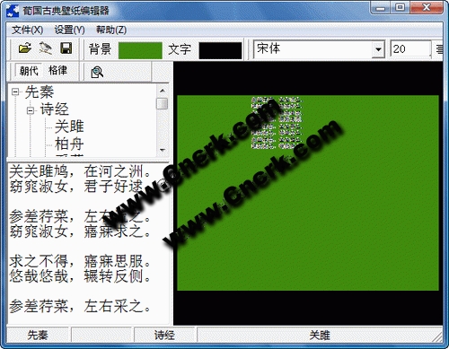 荀国古典壁纸编辑器 V1.0 简体中文绿色免费版 《荀国古典壁纸编辑器》是一个为古典诗词爱好者制作的壁纸编辑软件。你可以通过简单的操作来制作出精美的古典诗词壁纸,为你的桌面添加几分古典的诗情画意。可以选择你喜爱的图画和诗词来制作各种分辨率的壁纸、贺卡,也可以使用内附的三百首古典诗词和十六张国画素材。支持诗词竖排,图片缩放,制作完成的壁纸可以保存为BMP文件和JPG文件,也可以直接设为壁纸。