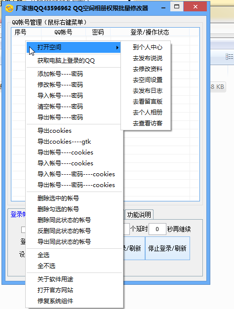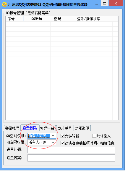 厂家惠QQ空间相册权限批量修改器是一款能够帮助用户快速进行空间相册修改的辅助小工具。东坡小编觉得这款软件界面简洁、功能强大,用户只需要登录QQ账号,即可进行批量相册权限设置修改功能。