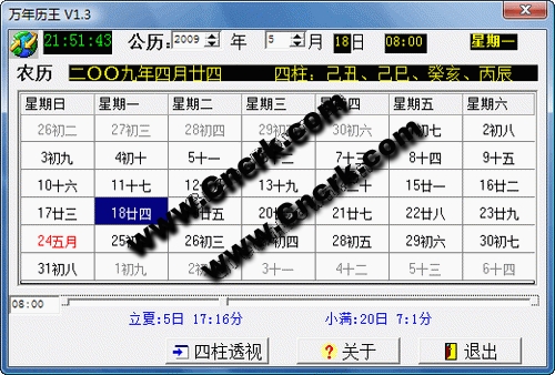 世界上第一款采用现代高精度天文历算算法制作的公历、农历对照、信息丰富、年代特长的多功能万年历。时间跨度长达4000年(起自格里历开始实行年之后的1583年,即明朝万历11年,止于公元5582年),可查询每日的公历、农历、伊斯兰历日期,节气、节假日,年月日的天干地支、节气的交节时刻、月相和朔望时刻,日月食,每时每刻月亮可见亮面比例,儒略日序、每日距今日天数、任意两个日期之间相距天数,每日的十二时柱,三伏、九九、入梅出梅日期,每日星座,世界各地时间对照,全国2600多个城镇的经纬度及这些城镇每天的日出、日落时间和昼长(日出到日落的时间长度)、日上中天时间、天亮、天黑时间和光照时间长度,月出、月落和月上中天时间, 任意时刻对应的世界时、地球力学时、地方平太阳时和真太阳时。还能以实时、定时和动画三种模式显示4000年中任意时刻太阳和月亮在本地天空中的位置以及在地球上的直射位置。可为气象、海洋、地理、地质、军事、历算、测绘、航空、航海、考古等方面的专业人士提供准确的数据,也可供人们在日常工作和生活中查询与日期、时间有关的多种信息。提供近200年的阴阳历对查。同时显示任一时间的八字信息,并将八字细化、直观化。同时提供某时刻生人的八字奇门与一生运程简析。是周易爱好者的得力工具