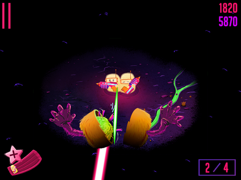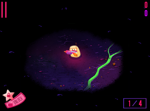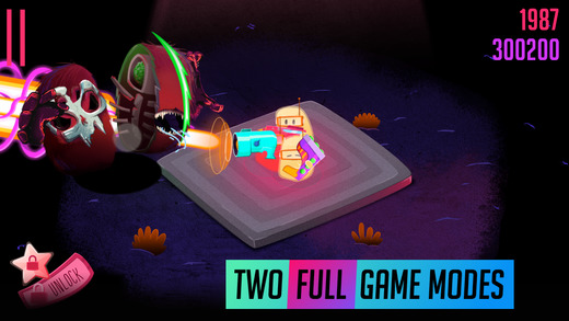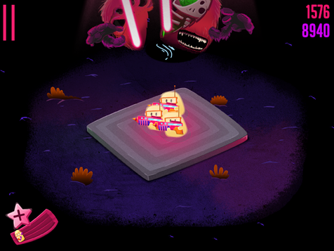 这些小不点的可视范围会随着队伍的扩大而逐渐增加,当队友人数达到上限时会升天转化为分数,只留下三名队员坚守,此时的人数上限会增加一名,依次类推到了后期如果发挥良好的话,画面中央会变成一大坨乳白色,而势力的扩大也意味着玩家的游戏生命会变得更持久。此外游戏还有一个生存模式,这里只有孤单的3个“小不点”,没有新的小伙伴加入,而怪物们都是带着铁面具的,需要射击2下才能杀死,所以更需要操作才能将该模式继续。