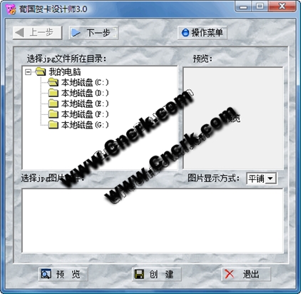 荀国贺卡设计师 V1.0 简体中文绿色免费版 主要功能:自定义背景图片及背景图片的显示方式(居中、平铺、拉伸)并可以选择背景音乐进行播放;自定义贺卡的样式。随意输入贺词进行播放,自定义贺词的字体、颜色支持从文本文中导入贺词和保存贺词;支持gif动画和flash动画的播放(flash动画可以直接从已打包的文件中导入)。自定义最终创建文件的图标让你的贺卡充满个性