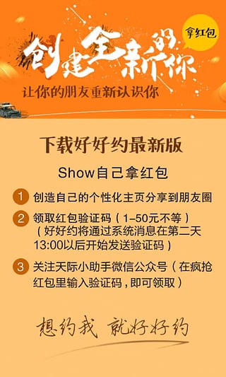 现在分享得现金红包,人气高者可拿千元红包! ~ 15年最好约的APP。想约我,就好好约!好好约是中国最大的职业社交平台天际网出品app。