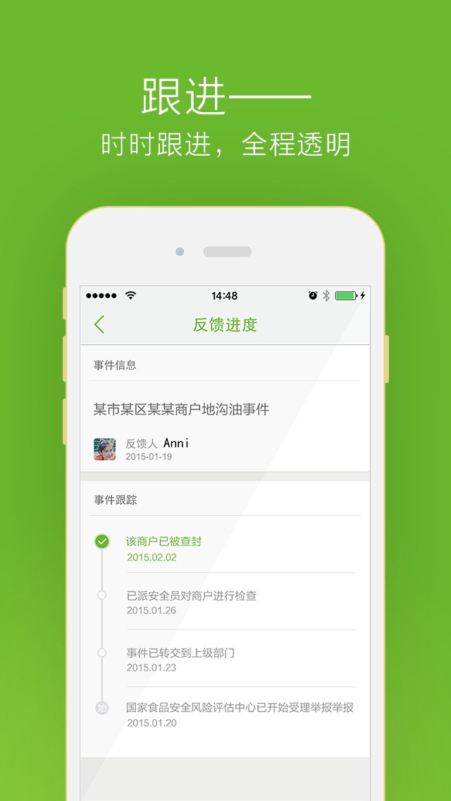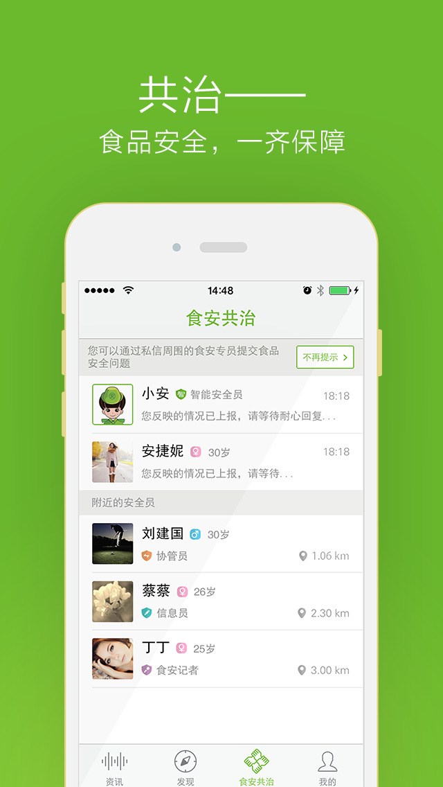(3)设立智能安全员小安,及时推送食品安全隐患事件预警。您也可以随时随地向小安反映身边的食品安全事件。要知道您关注的就是国家关心的,更是全社会需要的;