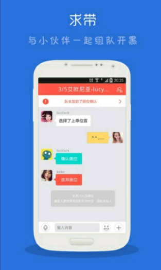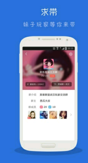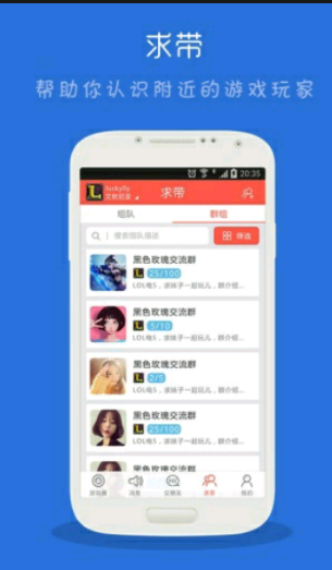 最潮的游戏玩家交友应用,五万游戏妹子共同的选择。提供亲密私聊,及时组队,海量比赛,随时随地找到身边玩家。也许你想认识网吧邻座可爱的英雄联盟妹子,也许你想知道同系女神是不是也和你玩一样的游戏,也许你想能够让全校最强王者带你赢一局。选择求带,分分钟组上靠谱队友,分分钟遇见知心游友,分分钟成为附近最瞩目的游戏明星。【软件特点】