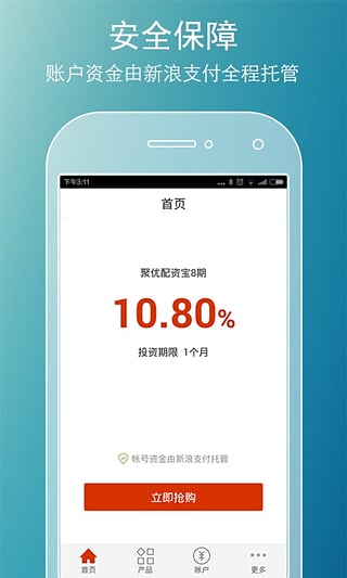 1、低投资门槛,年化收益10.8%:100元起即可投资任意理财产品,一个月短期限更灵活;高达30倍银行活期存款收益,秒杀余额宝;