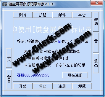 在界面的最上面有四个单选按钮-----(图片\按键\邮件\其它),分别用于设置是否要求定时保存图片、是否保存按键记录、是否定时发送邮件到您指定的邮箱、及是否要求开机自动运行等,试用版提供所有功能供测试。分别在界面的图片与按键中有两个长条形的文本框及上面有省略号“...”的按钮,单击此两按钮可以在此设置图片及按键内容所保存的文件夹。默认会保存在当前软件目录data文件夹中。