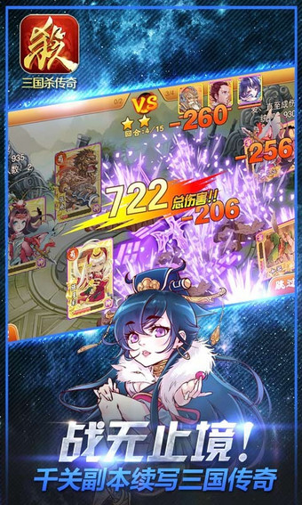 《三国杀传奇》是边锋重金投入的创新三国策略卡牌手游,具有武将变态式合体、技能颠覆式搭配的《三国杀》二代轻策略游戏。穿越三国杀的世界,在神秘人的帮助下,化身主公,招募三国群英,踏上狂杀三国反贼的传奇之旅,完美再现史诗级乱世三国。【游戏特点】