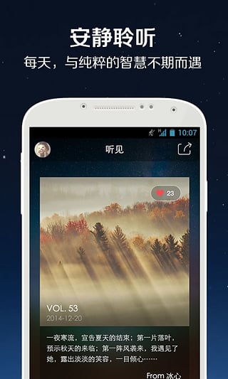 《听见》,最纯粹的精神阅读应用,每天给自己几分钟时间,换一种方式阅读世界,聆听一篇最精致的语音美文,开启心灵休憩、发现的旅程。《听见》,重新发现双耳的力量,闭上双眼,打开双耳,世事芜杂抛却身后,简单宁静回归心头,那一刻,让自己与世界上最激动人心的智慧不期而遇。