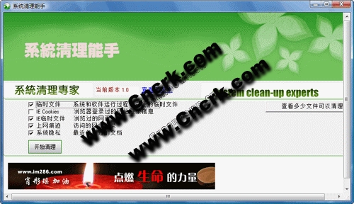 1.清理系统临时文件 1.清理IE COOKIE 3.清理历史痕迹 4.IE临时文件 5.清理最新使用文档 6.清理系统隐私 无须安装下载即可使用,方便到底