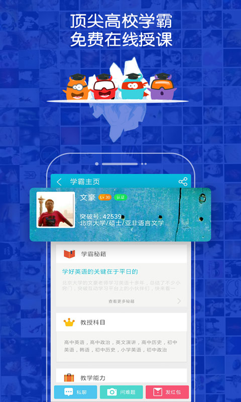 1、听学霸讲解知识点:重点难点全面分析、中考高考考前冲刺、语文数学英语理科文科各科都有学霸为你保驾护航!而且你还可以随时提问,不懂的疑问立刻给你解答!2、和学霸私聊:你可以向学霸提问,问出你不会的难题;你也可以向学霸请教经验,他会无所保留的给你辅导和建议;你甚至可以和学霸聊天,说出你内心的不愉快,他定会帮你疏导压力,助你愉快学习,提升成绩!