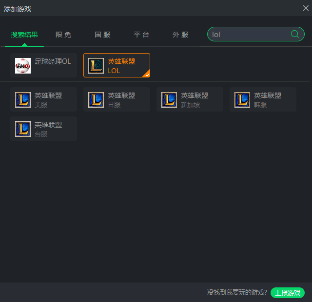 从弹出的【添加游戏】窗口中,直接在热门的游戏分类内或者在“搜索框”内搜索查找到您要玩的游戏。这里支持拼音、首字母以及游戏简称查询。例如您想查找“英雄联盟”可以在搜索框内输入“lol”三个字母,即可查找到英雄联盟相关的游戏,然后点击您要玩的游戏即可。