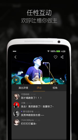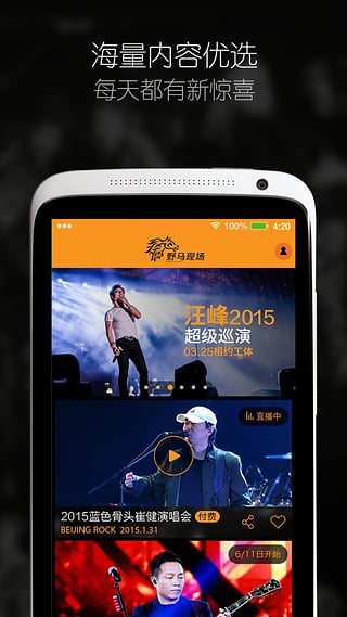 野马现场,无处不现场。我们为中国乐迷提供提供内容最优质,视角最丰富的国内外音乐现场演出直播。搜罗世界各类风格的音乐类型,每时每刻都进行音乐播放,让你透过手机就能览阅世界风情。