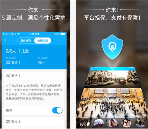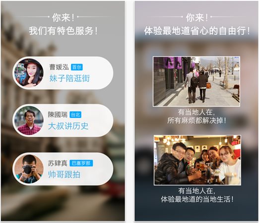 你来出境游致力于为语言不通的游客在环境陌生的情况下,提供最省心、最地道的境外自由行!「免费陪你出境游」活动进行中,免单券、代金券拿到手软!在这里,有上百位当地人,他们来自世界各地,他们热情好客而又个性鲜明,他们熟知当地文化,他们提供全程的中文服务,让远道的游客在自己的带领下,领略脚下之地的魅力!