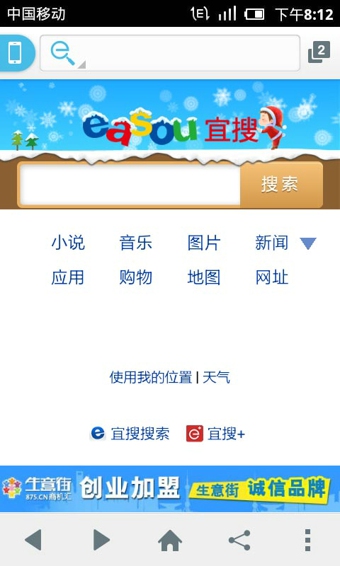 宜搜搜索采用业内先进的无线数据应用技术和搜索技术,依托网页、小说、音乐、图片、新闻、购物、应用、视频等专业的垂直搜索频道,为用户提供高品质的无线搜索服务。同时支持全拼或简拼快速搜索本机资源,包括应用、常用设置、MP3等。