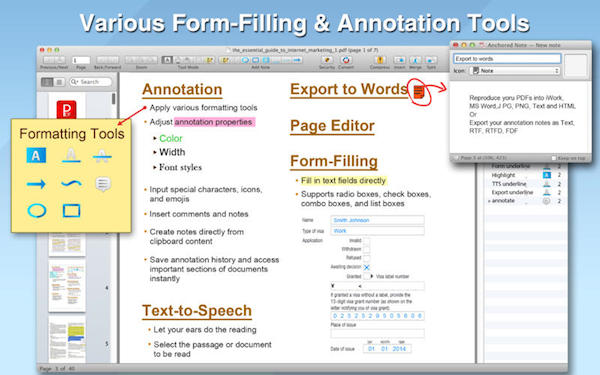 支持PDF表格填写,书签/大纲/缩图功能,签署文件,荧光笔标记,个人便签和标记工具:直线/箭头/圆形/方形;