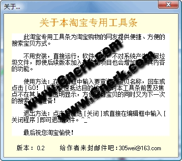 淘宝专用搜索工具 V0.2 简体中文绿色免费版 方便直接搜索淘宝宝贝,预设一些常用项目,更快捷地进行购物。