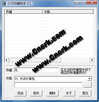 本工具是一款简单方便的热键辅助工具,您可以通过自定义热键的方式方便地实现用热键打开指定文件或目录、浏览网址、运行程序、打开/关闭光驱、重启/关闭系统等操作!