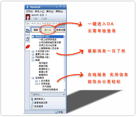 1.全面与RTX进行消息整合,实现了消息即时沟通与单位重要信息资料的沉淀。2.利用RTX就可以自由新建、收取邮件和单位公告、查看网络硬盘资料、相关日程安排等;