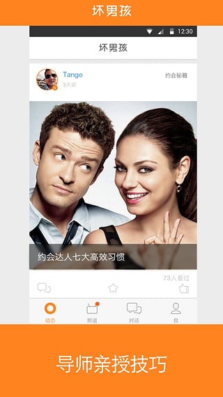坏男孩是一款男人必备的约会神器!这里是世界最大的男性约会技巧、恋爱艺术(PUA)社区。你可以在这里获取追女孩子的技巧、恋爱技巧和约会秘籍,帮你更高效地找女朋友。有了坏男孩,你不再需要在陌陌上追女生,也不需要在花田珍爱上相亲找女友。在这里,你可以找到男人装GQ没有的追女生技巧,找到跟你志同道合的僚机和搭讪大师帮你变成一个Hot男人和时尚先生。【软件特点】