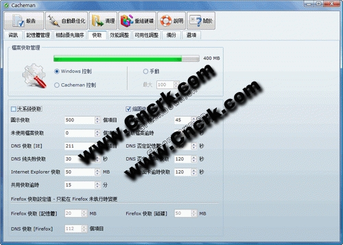 Outertech Cacheman V7.0 多国语言绿色特别版 在所有的Windows环境设置中,缓存Cache的设置管理是一项不可或缺的内容,Windows最大的一个缺陷在于它磁盘缓存管理的策略,如果所有的RAM都被使用了,Windows就开始使用虚拟内存,而不是重新补充已经耗尽的磁盘缓存。幸好Cacheman能够根据你的不同使用需要,自动设置合理的Cache指标