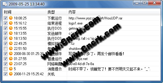 HOU任务计划一款定时/循环执行任务的软件,可以用来定时执行程序、DOS命令、从网络下载运行、结OnTime束进程、模拟按键、发送EMAIL、网络唤醒、 消息提示、关机、重启、注销等操作,都是本人曾经所想要的功能