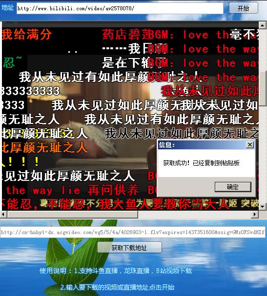 B站视频下载工具是一款支持下载龙珠直播/斗鱼直播/B站这三个网站直播视频的下载工具,软件绿色小巧,用起来非常的简单方便!软件能够用于观看龙珠直播、斗鱼TV以及B站(哔哩哔哩)等视频,用户可以通过直播或在线视频的链接解析到视频的下载地址,之后就可以用浏览器或下载工具下载视频了。有了这款B站视频软件,你还用担心视频无法保存到本地么。可以把喜欢的视频下载下来,保存之后慢慢看!【使用方法】