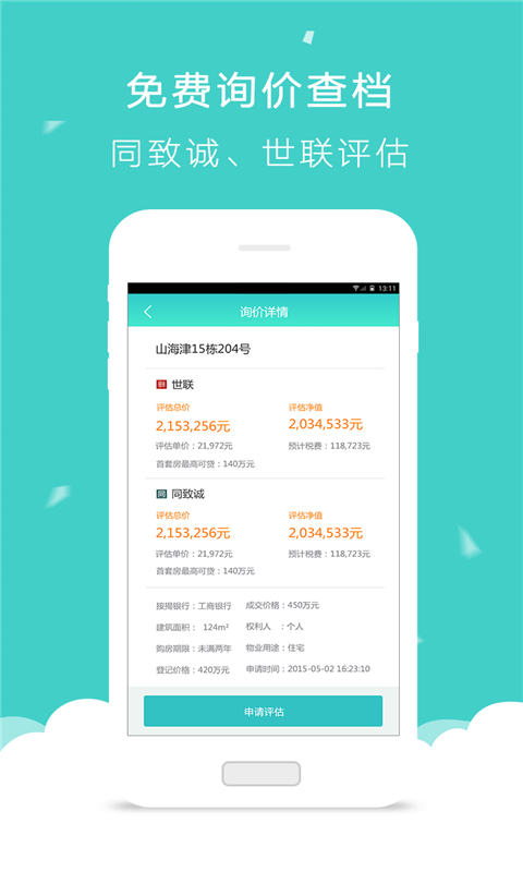 3、你随时随地都可无忧询价。快鸽按揭系统和同致诚和世联系统对接,只需滑动手指,就询价完毕,马上能在APP上回复按揭员。