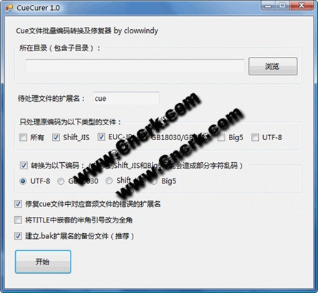 能自动识别cue文件的编码格式,根据设置将子目录中的cue文件批量转换为制定的编码格式,并能自动修复cue文件中错误的音频文件扩展名,如CDImage.wav->CDImage.tta