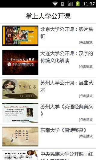 掌上大学公开课是一款免费的手机公开课视频App,里面收录了全网近年来最热门的精品公开课视频资源。所有的资源完全免费,可以在线观看,也可离线缓存,无需注册登录,打开应用就看。【软件特色】