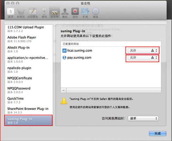 ②选择【suning Plug-in】,将下图右边红框框出的下拉框由“禁止”设置为“允许”