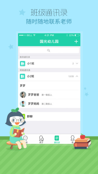 方便地查询家长的联系方式,能电话、短信联系,或者在线聊天,及时方便。