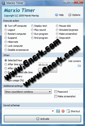 Marxio定时器是一个易于使用软件,通用计时器,提醒和日程安排工具,可以用来执行多种不同的任务类型(关闭电脑,重新启动,锁定屏幕,显示文字,运行选定的应用程序,发送按键等)