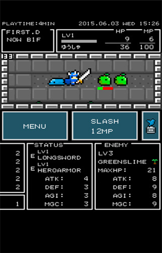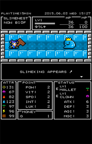 消遣迷宫(ひまつぶダンジョン)是一款画面简单、剧情简单的像素风格RPG游戏,正如标题所示,游戏整体主打休闲消遣,采用自动存档机制,支持玩家随时中断和再开。内容剧情方面十分精简,开场白也是敷衍得不行,总之玩家的目的就是趁空余时间去打倒魔王!玩家触控屏幕左右部分即可控制勇者移动,进入地下城后点击行进方向直接对怪物展开攻击。虽然勇者挺容易被干趴,不过回城后国王会赠与武器和防具,增强实力再去挑战,所以完全不用怕死掉呢!