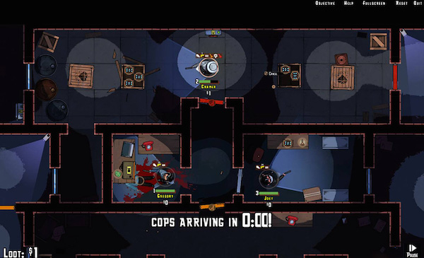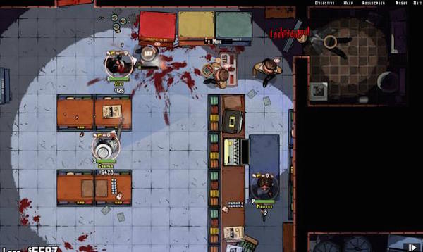 总体规划游戏的策略性极强,合理分工,如何在作案时不被警察通缉等等都需要玩家费些脑子。地图到后期会很大,人数也会增加,稍有不慎很容易演变成暴力枪战,总而言之这款游戏虽然短小但是非常刺激。1、点击鼠标左键选择人物。也可以拖选多个人物,点击右键移动,右键点击物品物品或人物可以捡起/攻击。