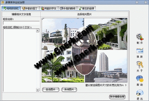 该软件是学生毕业时自主设计“多媒体毕业纪念册”的好帮手。它集图像、文字、音乐等于一体,包括母校风情,恩师嘱托,同学资料与留言,师生合影及校园生活等。