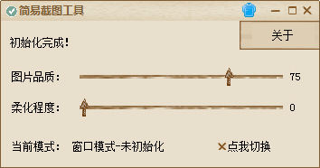 2015简易截图工具 1.0 绿色版 简易截图助手是一款简单小巧绿色的截图小工具。该工具界面简单清爽,可支持窗口化模式和全屏化模式,让截图更加方便自然,有需要的朋友不妨下载用用看。
