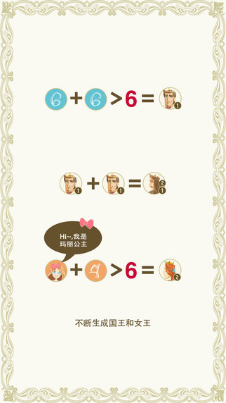 点击空格融合四个方向的相同数字超过6就变成国王,公主会变成王后
