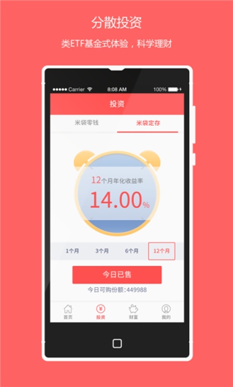 米袋零钱收益每日结算,收益自动复投,继续产生复利;并且可随时提现,最快2小时到帐,灵活方便。米袋定存锁定期1月、3个月、6月、12月,到期返还本息,收益自动进入米袋零钱继续升值。