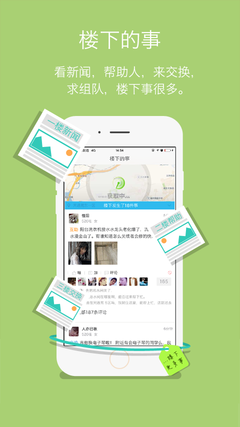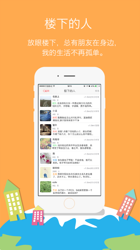看看“楼下的人”,认识活跃于你周围的用户。 放眼楼下,其实生活并不孤单,关注Ta们的生活,让自己总有朋友在身边。