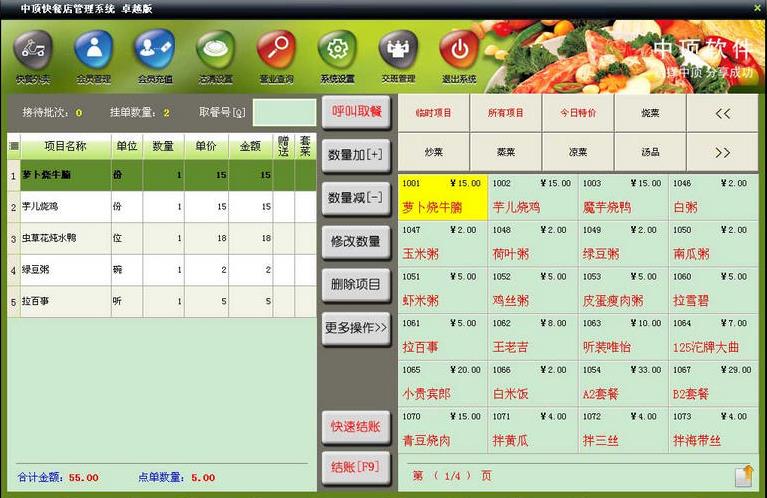 中顶快餐管理系统全面革新并明确了快餐综合管理的概念和范畴,将内部嵌入式计算的准确和即时性与外部网络管理的便捷与灵活性进行了完美的结合,从而使管理者可以更自由、更准确、更便捷地对会员、顾客档案,商品库存,财务状况和其他各种经营情况进行动态追踪管理。针对快餐经营管理特点设计的最专业的计费、收银、预结、套餐、会员、打折、储值、刷卡消费解决方案。系统功能全面,开台、挂帐、结帐简单易学,会员个性化管理自由设定,后台监控、报表统计是您经营管理的最佳助手。适用于中西式快餐、炸鸡店、自助餐厅、奶茶店、美食城、酒吧等大中小型餐饮企业。