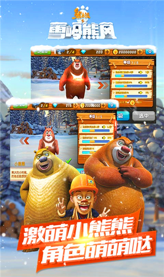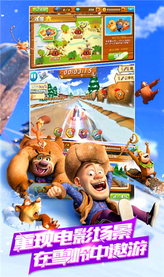熊出没之雪岭熊风2015是2015年贺岁档电影《熊出没之雪岭熊风》官方正版授权同名竞速休闲手游,游戏不仅使用了热门儿童动画《熊出没》作题材,并且游戏过程中加入了大量的剧情元素,使你在体验游戏精彩内容同时更容易身临其境。新增小雪熊角色,轮盘玩法即可赢取充值卡,公仔等的礼品。【游戏特色】