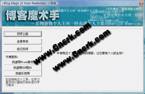 美化博客的好助手!具有生成代码,装饰博客的功能。可插入FLASH、图片、音乐、QQ聊天按钮等功能。用它装饰的博客,很生动。不会写代码的朋友 只需要提供一个音乐或者图片的引用地址就能生成代码放在博客里了