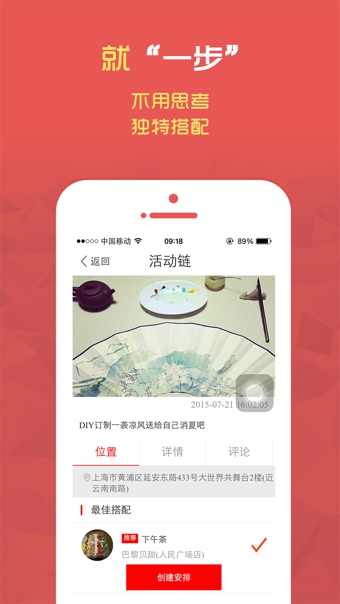 我们提供智能搜集活动并做相应推荐的功能,为用户搜集离他较近的一些成组的活动安排。每一组活动安排在地理上是非常接近的,用户不需要烦恼诸如选了一个地方吃饭,不知道附近有啥可接着逛接着玩的地方这样的麻烦。此外,推荐的每一组活动都具有情景上的相似性:或是比较安静的座谈情景,或是比较动态的逛街情景,或是一次充实的健身及周边安排。