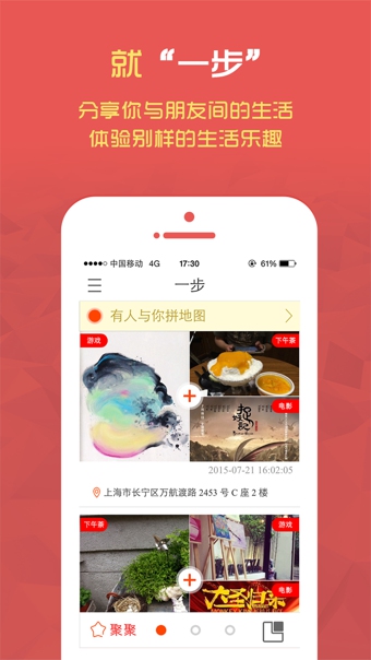 无缝对接微信、朋友圈、微博、qq空间:未下载“一步约友”用户只需要打开微信h5页拼地图,即可简单给定出发地点参与安排;随时分享最新活动安排表到朋友圈;随时查看活动安排详情,无缝对接活动提供商户;